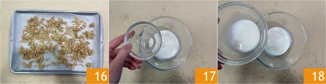 Répartissez le crumble sur une plaque recouverte de papier sulfurisé 16 et placez-le au congélateur pendant 2 heures. Passez à la préparation de la crème aigre : dans un bol, versez la crème fraîche, le vinaigre 17 et le lait 18.