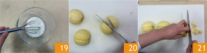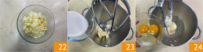 Mélangez avec le fouet 19 et laissez à température ambiante pendant 20 minutes, sans couvrir. Passé ce temps, couvrez de film plastique et placez au réfrigérateur jusqu'à utilisation. À ce stade, occupez-vous de la pâte : pelez et coupez les pommes pour obtenir environ 220 g, réduisez-les en fines tranches, d'une épaisseur d'environ 3 mm 21.