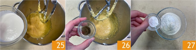 Mettez-les dans un bol et réservez 22. Dans le bol d'un robot équipé d'une feuille, mettez le beurre à température ambiante et le sucre 23, puis actionnez à vitesse moyenne-élevée. Une fois une consistance crémeuse obtenue, éteignez la machine de temps en temps pour racler avec la spatule la pâte restée sur les bords. Ajoutez les œufs, un à la fois 24.