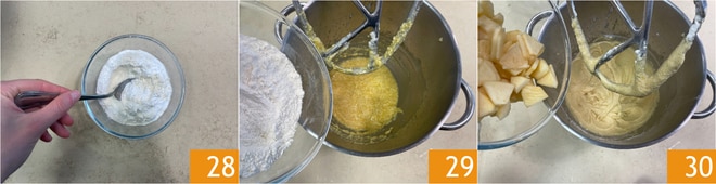 Mélangez avec une cuillère 28 et versez les poudres dans le robot 29. Une fois le tout amalgamé, réduisez la vitesse et incorporez les pommes 30.