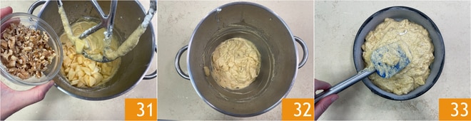 Complétez avec les noix grossièrement concassées 31. La pâte est prête 32, versez-la dans un moule à charnière de 21 cm de diamètre, beurré et fariné. Nivelez bien la pâte avec la spatule 33.