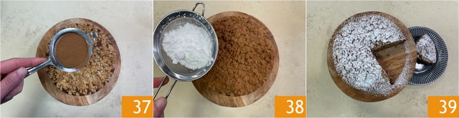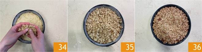 Répartissez sur la surface le crumble émietté 34. Cuisez dans un four statique préchauffé à 160° pendant 60 minutes 35. Une fois cuite, sortez-la du four et laissez-la refroidir complètement 36.