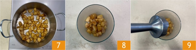 Cuisez à feu moyen-doux pendant environ 15 minutes, en mélangeant de temps en temps avec une cuillère jusqu'à ce que les pommes soient cuites 7. Transférez les pommes cuites dans un récipient 8 et mixez avec un mixeur plongeant 9.