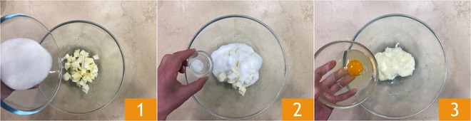 Pour préparer la tarte aux pommes et caramel, versez dans un bol le beurre, le sucre 1 et le sel 2, pétrissez à la main puis ajoutez l'œuf 3.