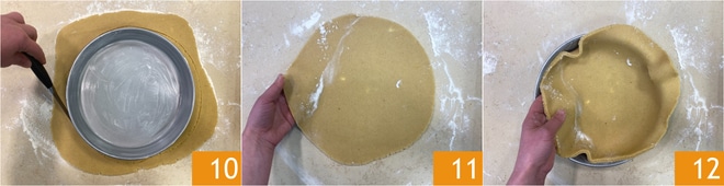 Sur la pâte, déposez un moule de 22 cm et découpez un disque 10 légèrement plus grand que le moule, de manière à recouvrir le fond et les bords 11. Insérez la pâte dans le moule beurré 12 et faites-la bien adhérer 12.