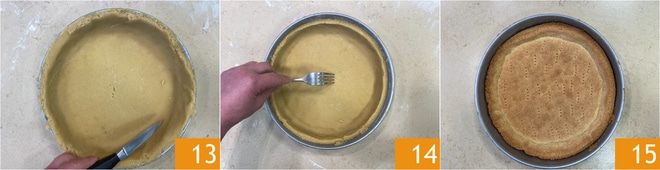 Coupez le bord avec un couteau pour le baisser 13, piquez le fond 14, faites cuire dans un four statique préchauffé à 180° pendant 15 minutes. Une fois cuite, sortez-la du four et laissez refroidir 15.