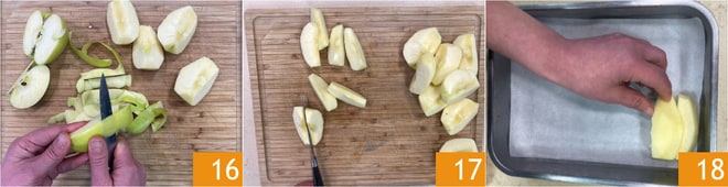 Préparez les pommes : épluchez-les 16 et coupez-les en quartiers 17, déposez-les sur un plat allant au four recouvert de papier sulfurisé 18.