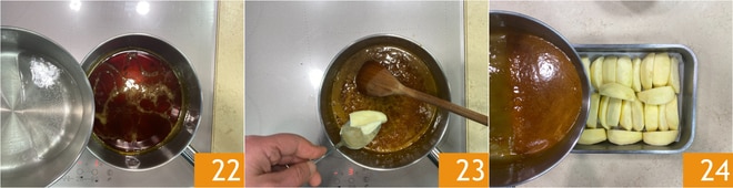 Une fois prêt, versez en deux fois l'eau bouillante 22, mélangez pour homogénéiser, puis éteignez le feu et incorporez le beurre 23. Versez le caramel sur les pommes 24.