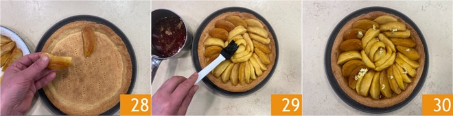 Maintenant, disposez les pommes en rosace sur la pâte brisée 28. Ensuite, chauffez le caramel et badigeonnez-le sur les pommes 29. La tarte aux pommes et caramel est prête, vous pouvez l'agrémenter à votre guise de feuilles d'or 30.