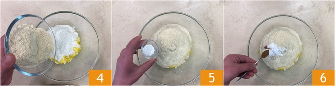 Maintenant, incorporez les farines 4, la levure 5 et la cannelle 6.
