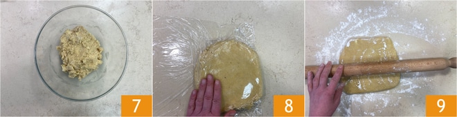 Pétrissez pour obtenir une pâte homogène et lisse 7, formez une boule, enveloppez-la dans un film alimentaire et placez-la au réfrigérateur pendant 1 heure 8. Étalez la pâte brisée avec un rouleau à pâtisserie 9 jusqu'à une épaisseur de 3 mm.