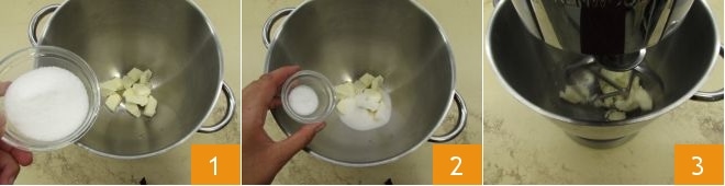 Pour préparer la tarte aux prunes meringuée, commencez par réaliser la pâte. Versez dans le bol d'un batteur le beurre en dés, le sucre 1 et le sel 2. Travaillez le tout avec la feuille 3,