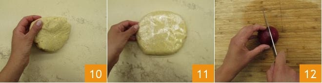 Transférez-le ensuite sur un plan de travail, compactez-le 10 et enveloppez-le dans un film alimentaire 11. Laissez reposer au réfrigérateur pendant environ une heure. Pendant ce temps, lavez les prunes et coupez-les en deux 12.