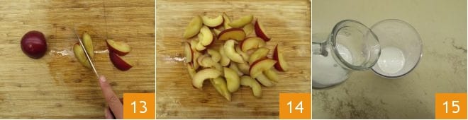 Puis, en retirant le noyau, découpez des quartiers (13-14). Réservez les prunes et versez le lait et la crème dans un récipient à bords hauts 15.