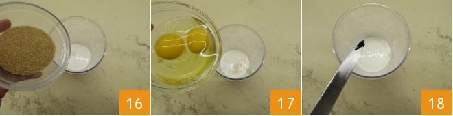 Ajoutez le sucre de canne 16, les œufs 17 et les graines de la demi-gousse de vanille 18.