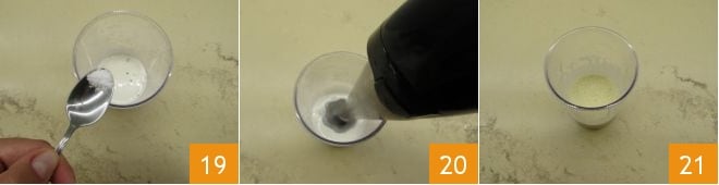 Ajoutez une pincée de sel 19 et mixez le tout avec un mixeur plongeant pendant quelques minutes 20, jusqu'à obtenir un mélange homogène 21.