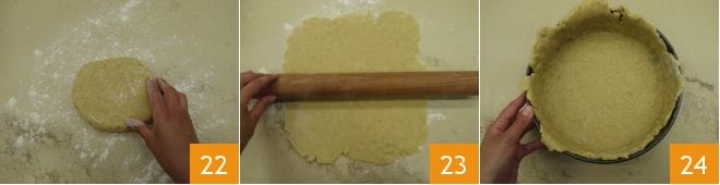 À ce stade, reprenez la pâte 22 et étalez-la jusqu'à obtenir une épaisseur d'un demi-centimètre 23. Puis transférez-la dans un moule à charnière de 22 cm en pressant délicatement pour qu'elle adhère bien sur tout le bord 24.