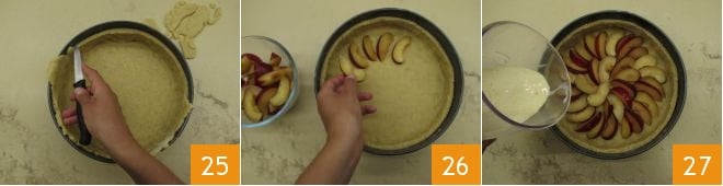 Puis, à l'aide d'un petit couteau, éliminez l'excès de pâte pour obtenir un bord d'environ 3 cm 25. Disposez ensuite les quartiers de prune en rosace sur le fond 26 et versez dessus le mélange de lait, d'œufs et de crème 27.