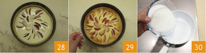 À ce stade 28, faites cuire dans un four statique à 180° pendant environ 60 minutes sur la grille centrale. Retirez du four et laissez refroidir 29. Lorsqu'elle est froide, vous pouvez préparer la meringue italienne. Versez de l'eau et du sucre dans une petite casserole 30.