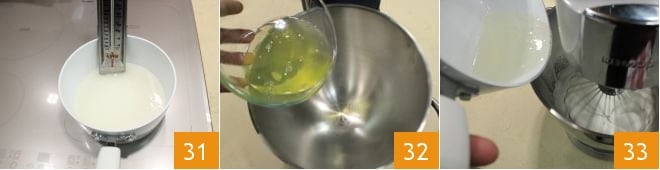 Chauffez le sirop jusqu'à 121° 31. Lorsqu'il est presque à température (114°), versez les blancs d'œufs dans le batteur propre 32 et fouettez-les à vitesse moyenne. Lorsque le sirop atteint la température, versez-le en filet sur les blancs montés 33.