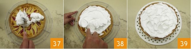 et placez la meringue sur le dessus à l'aide d'une cuillère 37. Puis, avec le dos d'une spatule, étalez-la pour obtenir l'effet meringué classique 38. Transférez sur un plat de service et servez la tarte 39.