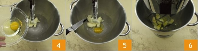 ajoutez ensuite l'œuf 4 et les graines d'une demi-gousse de vanille 5. Travaillez encore jusqu'à ce que le tout soit bien absorbé 6.