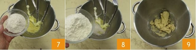 Ajoutez ensuite la farine intégrale 6 et la farine 00 8. Remettez la machine en marche et travaillez le mélange jusqu'à obtenir une texture homogène 9.