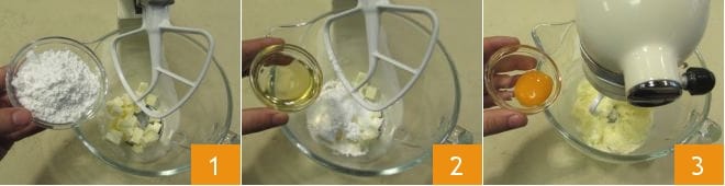 Pour préparer la tarte couverte avec pomme, fruits secs et pain, assurez-vous de sortir le beurre du réfrigérateur à temps pour qu'il soit mou mais encore plastique et coupé en petits morceaux. Mettez-le dans le robot pâtissier équipé de la feuille, ajoutez le sucre glace 1 et le miel d'acacia 2. Actionnez le robot pâtissier à la vitesse la plus basse : le beurre doit absorber le miel et le sucre, mais ne doit pas monter. Arrêtez le robot, dissolvez le sel dans très peu d'eau (environ une cuillère à café) et versez dans le robot. Ajoutez également le jaune d'œuf 3 et actionnez à nouveau à basse vitesse.