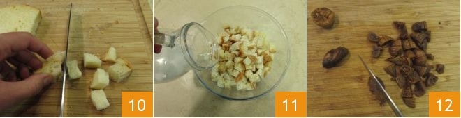 Coupez le pain en dés 10, mettez-le dans un bol et imbibez-le avec le lait entier et le lait d'amande 11 et laissez absorber. Coupez les figues sèches en petits morceaux 12.