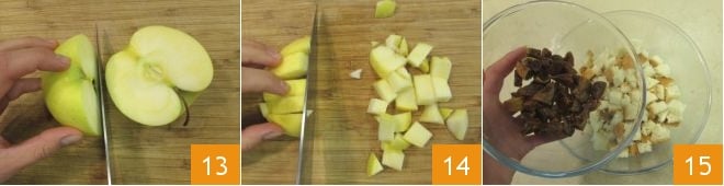 Lavez les pommes et réduisez-les en dés en gardant la peau (13-14). Incorporez au pain également les figues sèches 15,