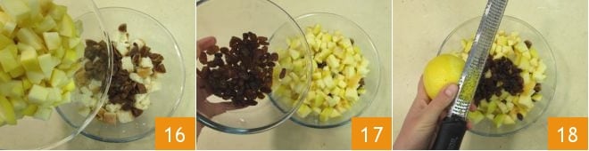 les pommes 16 et les raisins secs ramollis dans le rhum et égouttés 17. Parfumez avec le zeste de citron 18