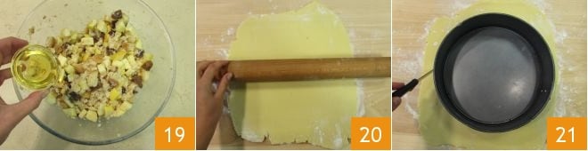 et relevez avec le miel d'acacia 19. Réservez la garniture et reprenez la pâte : étalez-la sur une planche légèrement farinée à une épaisseur d'environ un demi-centimètre 20. Posez dessus un moule à charnière de 22 cm et découpez la pâte en suivant la forme du fond 21.