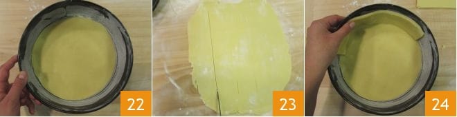 Placez le disque obtenu à l'intérieur du moule déjà beurré et fariné 22. Étalez un autre morceau de pâte pour obtenir des bandes rectangulaires 23 à appliquer sur le bord 24.