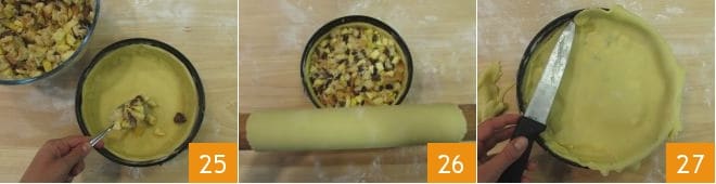 À ce stade, versez la garniture à l'intérieur du moule 25. Étalez le reste de pâte, toujours à un demi-centimètre d'épaisseur, enroulez-la sur le rouleau à pâtisserie et étalez-la sur le moule 26, de manière à refermer la tarte. Découpez l'excès de pâte avec un petit couteau 27.