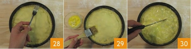 Créez un motif décoratif sur le bord en exerçant une légère pression avec les dents d'une fourchette 28. Badigeonnez la surface avec l'œuf battu 29 et incisez la pâte en créant des rayons 30, cela permettra la sortie de la vapeur pendant la cuisson.