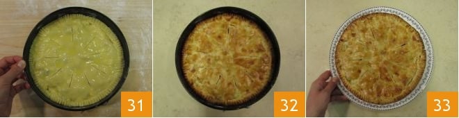 Le dessert est prêt pour la cuisson 31, faites-le cuire dans un four statique préchauffé à 170° pendant 45 minutes, au milieu du four. Une fois la cuisson terminée, sortez la tarte couverte avec pomme, fruits secs et pain 32, laissez-la refroidir puis démoulez-la 33.
