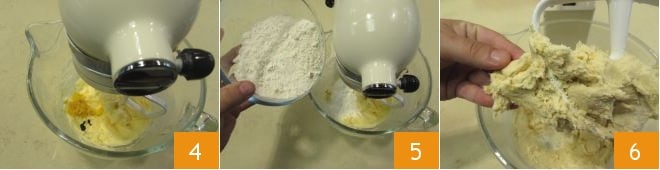 Fendez la gousse de vanille dans le sens de la longueur et récupérez les graines, versez-les dans le robot avec le zeste de citron râpé 4. Tamisez la farine et versez-la d'un coup dans le robot 5, continuez à mélanger jusqu'à ce que le beurre ait incorporé toute la farine et que la pâte soit bien homogène 6.