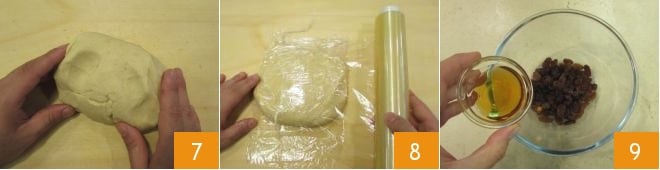 Renversez ensuite la pâte sur un plan de travail, modelez-la pour lui donner une forme cylindrique 7, aplatissez-la et enveloppez-la dans du film plastique 8. Placez-la au réfrigérateur pour un couple d'heures. Pendant ce temps, préparez la garniture : lavez et faites ensuite ramollir les raisins secs dans le rhum 9.
