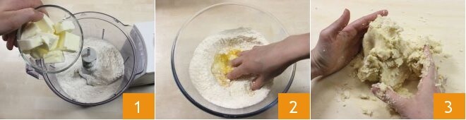 Pour réaliser la tarte de patates douces, commencez par préparer la pâte brisée : mettez dans le mixeur la farine, une pincée de sel et le beurre coupé en morceaux à peine sorti du frigo 1. Mixez le tout jusqu'à obtenir un composé sableux, ajoutez le sucre, le zeste de citron pour aromatiser la pâte. Ensuite, versez les jaunes d'œufs 2 et amalgamez rapidement le tout 3 jusqu'à obtenir une pâte compacte et assez élastique.