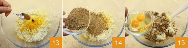 et la cannelle 13. Ajoutez également le cacao 14, le sucre de canne et les œufs entiers 15