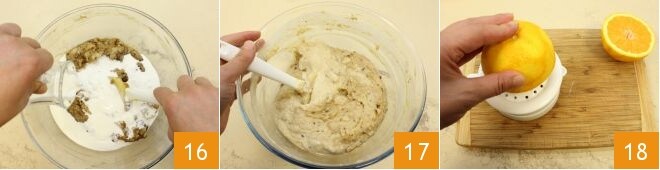 et la crème fraîche 16, mélangez avec une spatule pour amalgamer les ingrédients 17, pressez le jus de l'orange 18,