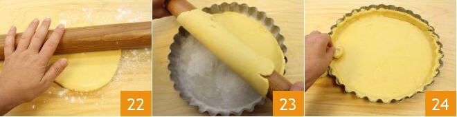 Sortez la pâte brisée du réfrigérateur, étalez-la avec le rouleau à pâtisserie sur un plan légèrement fariné 22, vous devez obtenir une abaisse ronde de 1 cm d'épaisseur qui soit plus large que le moule afin de couvrir les bords du moule. Enroulez alors la pâte brisée sur le rouleau à pâtisserie et déroulez-la sur le moule 23, de cette manière vous éviterez que la pâte se casse. Faites adhérer la pâte à la base et aux bords en vous aidant d'un morceau de pâte enveloppé dans un film alimentaire 24.