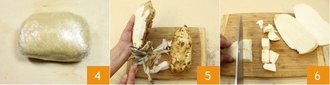 . Formez avec la pâte obtenue une boule, enveloppez-la dans du film alimentaire 4 et mettez-la au repos au réfrigérateur pendant au moins une demi-heure. Occupez-vous de la garniture : épluchez les patates 5, coupez-les en dés 6