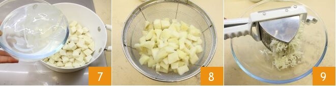 cuisez dans une casserole remplie d'eau 7 pendant environ 15-20 minutes, jusqu'à ce qu'elles soient tendres, faites le test en les piquant avec une fourchette. Égouttez-les 8 et réduisez-les en purée avec un presse-purée 9, recueillez la purée dans un bol,