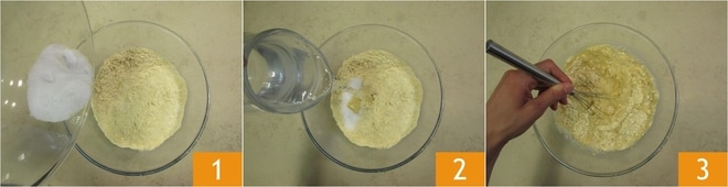 Pour préparer la tarte de pois chiches, commencez par verser dans un bol la farine de pois chiches et le sel 1. Ajoutez 1/3 de l'eau 2 et mélangez jusqu'à obtenir un mélange sans grumeaux 3.