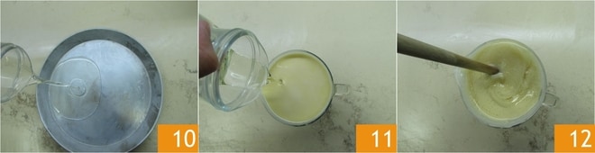 Huilez 2 plaques de 30 cm avec 50 g d'huile chacune 10. Versez les 100 g d'huile restants dans le mélange 11 et mélangez bien 12.