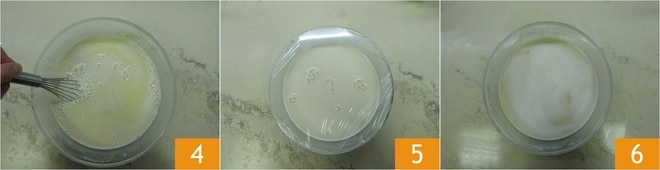Ajoutez l'eau restante et mélangez à nouveau 4. Couvrez d'un film plastique 5 et laissez reposer de 1 à 3 heures. Le temps de repos varie selon la saison, plus il fait chaud, plus cela sera rapide 6.