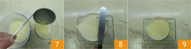 Versez le mélange dans un pichet 7, en le faisant légèrement déborder pour que la mousse s'échappe. Utilisez une spatule pour éliminer toute mousse restante 89.