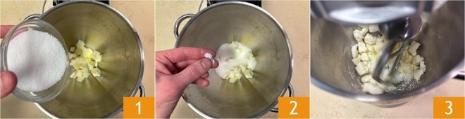 Pour préparer la tarte mimosa, commencez par la pâte sablée : dans le bol du robot muni de la feuille, mettez le beurre en morceaux, sorti du réfrigérateur 5 minutes avant, le sucre 1 et une pincée de sel 2. Actionnez le fouet pour mélanger rapidement 3.