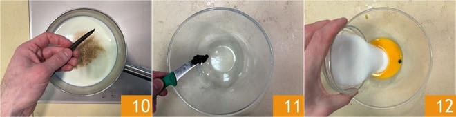 Pour préparer la crème pâtissière, extrayez les graines de la gousse de vanille, puis portez le lait à ébullition avec le zeste de citron, la gousse, une pincée de cannelle en poudre, et une pincée de sel 10. Pendant ce temps, dans un bol, mélangez les graines de vanille 11, les jaunes d'œufs et le sucre 12.